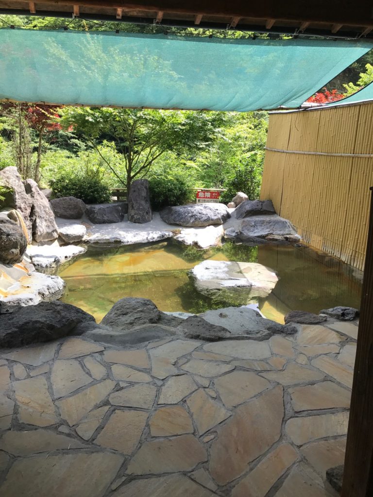 露天風呂きれいにしました。(脱衣場の床、ヒノキに張り替え、洗い場鉄平石張り替え)